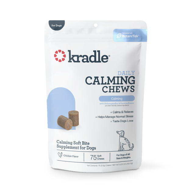 Dental chews designed to support healthy teeth and gums. Each dog chew is formulated with Kradle’s Proprietary BotaniTek™ Dental Blend which includes Ashwagandha, Chamomile, Chlorophyll, Brewer's Yeast and a probiotic strain Lactobacillus Paracasei to help keep your pet's teeth healthy and clean.